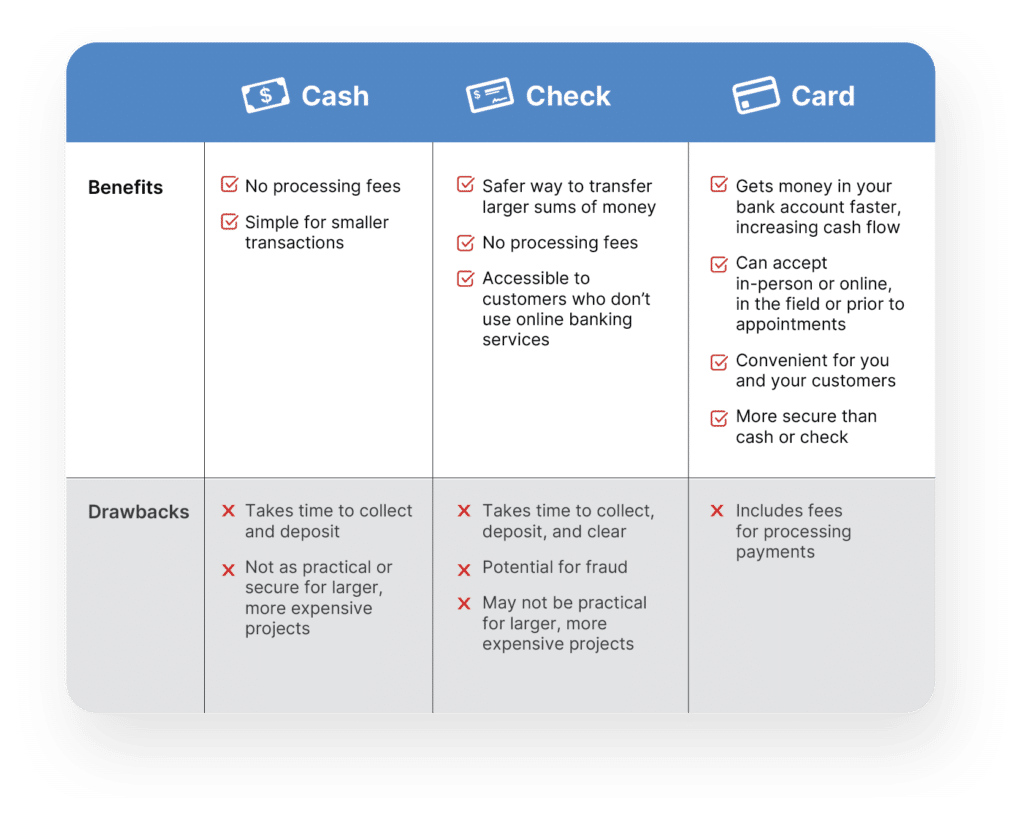 We’ll give you a quick overview of field service payments. Then, we’ll list the pros and cons of three of the most common payment options: check, cash, and card.